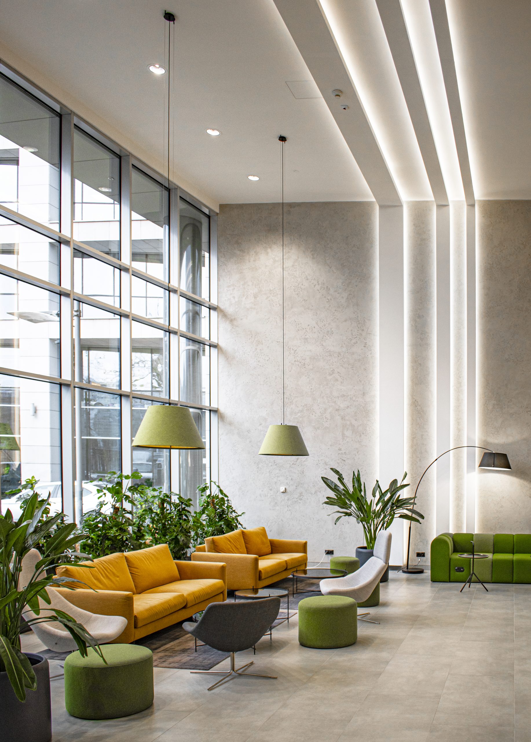 Abundant natural light and lush green surroundings enhance the building’s warm and inviting atmosphere.